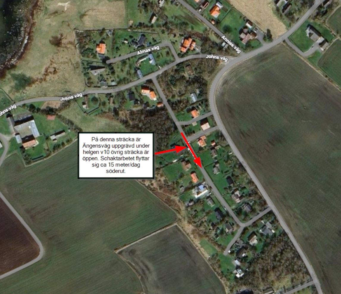 Arbetet är några veckor försenat på grund av tjäle i marken. Just nu arbetar vi på Ängens väg och planerar att bli klara där innan påskhelgen. Då ska du kunna ta dig fram till din stuga som vanligt.